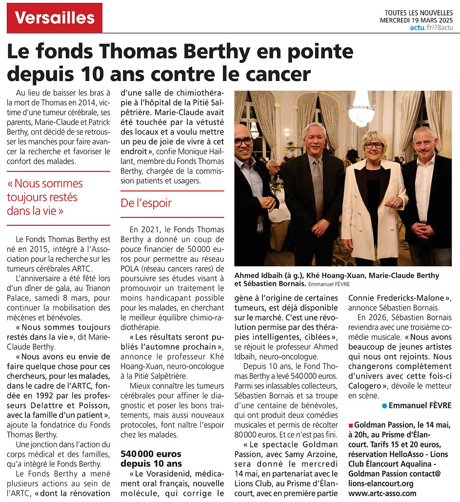 Thomas ayant été soigné à l’hôpital de la Pitié-Salpêtrière dans le service du professeur Jean-Yves Delattre, il leur a paru naturel de reverser les dons reçus à l’ARTC.